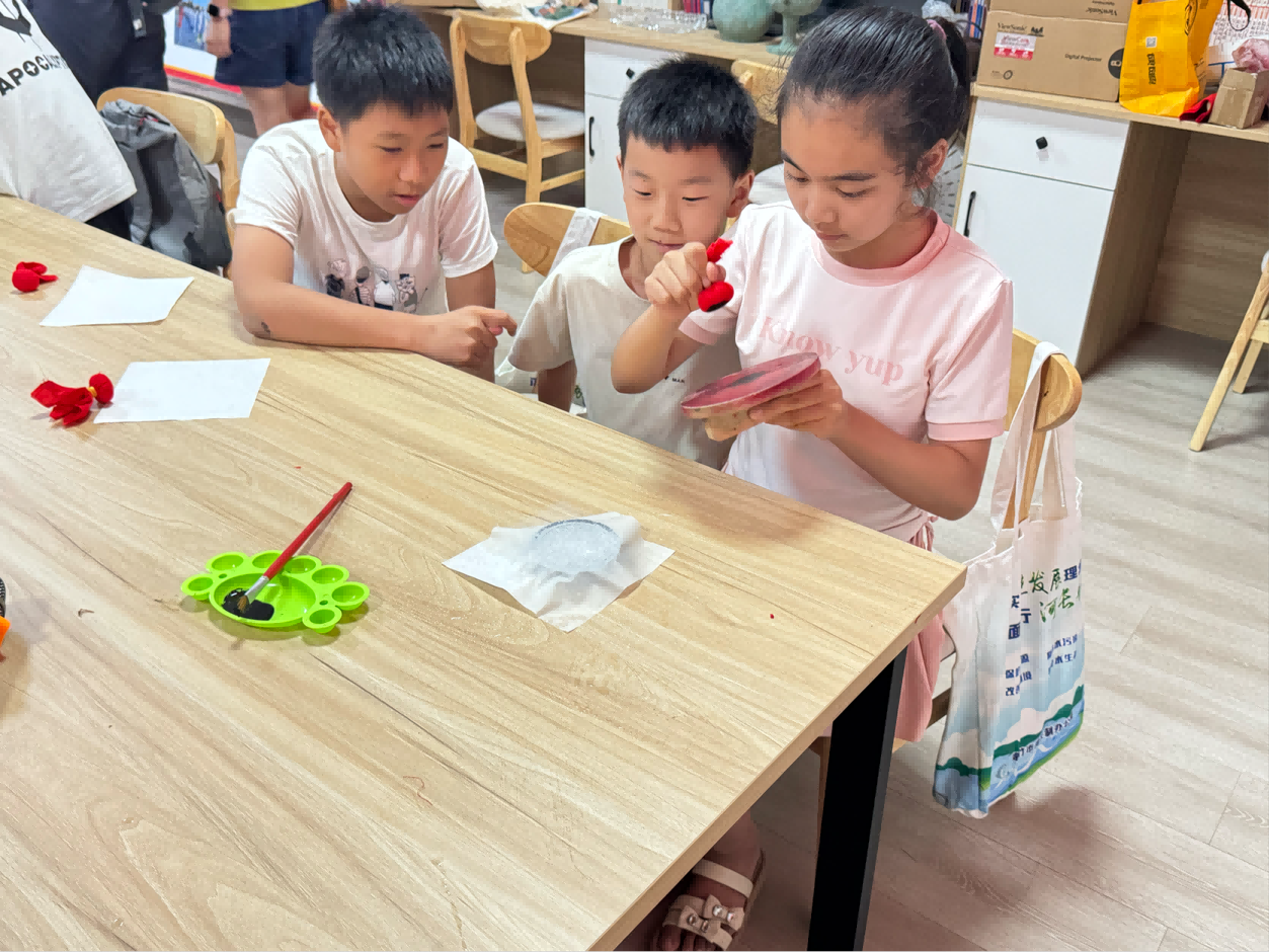 随后,小朋友们迎来了非遗传承拓片工艺体验环节。工作人员为孩子们发放制作拓包的材料,详细讲解拓包的制作方法和拓片的工艺流程。小朋友们亲自动手,制作出一个个专属的拓包,接着在工作人员和志愿者的指导下,小心翼翼地进行拓片体验。他们轻轻拍打、均匀上色,看着图案逐渐清晰地呈现在纸上,孩子们脸上洋溢着成功的喜悦,真切感受到非遗技艺的独特魅力。