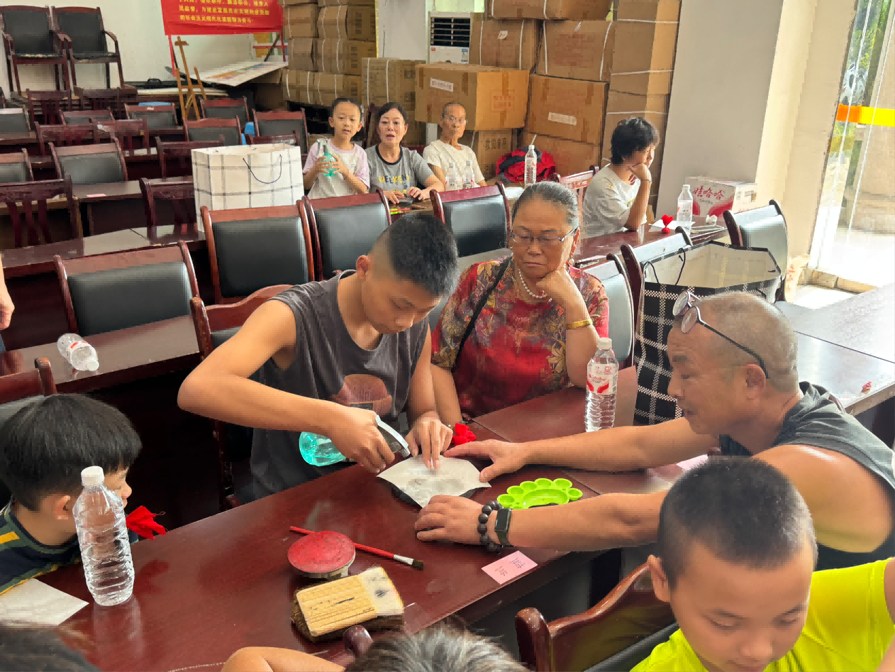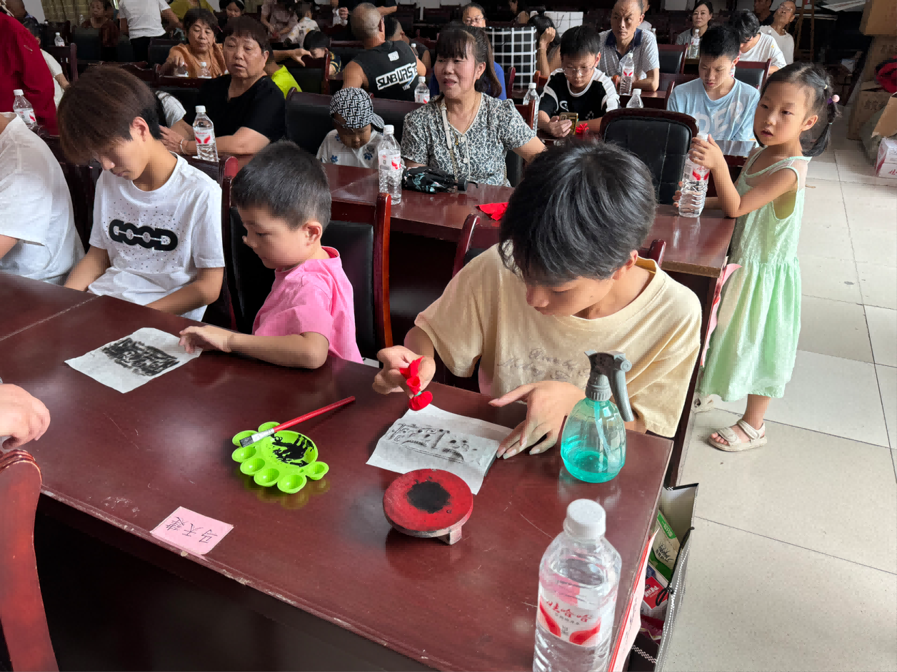 随后的非遗传承拓片工艺体验环节更是将活动推向高潮。工作人员为小朋友们分发制作拓包的材料,如棉布、棉花、皮筋等,并细致讲解拓包制作步骤。小朋友们全神贯注,动手将棉花团成小团,用棉布包裹,再用皮筋精心捆扎,不一会儿,一个个充满童趣的拓包便制作完成。在工作人员和志愿者手把手指导下,小朋友们开启拓片之旅。看着自己亲手完成的拓片,每个小朋友脸上洋溢着自豪与喜悦。